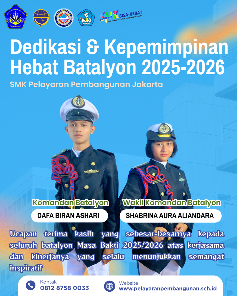 Feb 25 2026 0 Dedikasi dan Kepemimpinan Batalyon 2025-2026 SMK Pelayaran Pembangunan Jakarta By Admin Terimakasih yang sebesar-besarnya kepada seluruh batalyon masa bakti 2025/2026 atas kerjasama dan kinerja yang selalu menunjukan semangat inspiratif Post navigation Previous PostPrevious Komandan Batalyon dan Wakil Komandan Batalyon Pariode 2026/2027